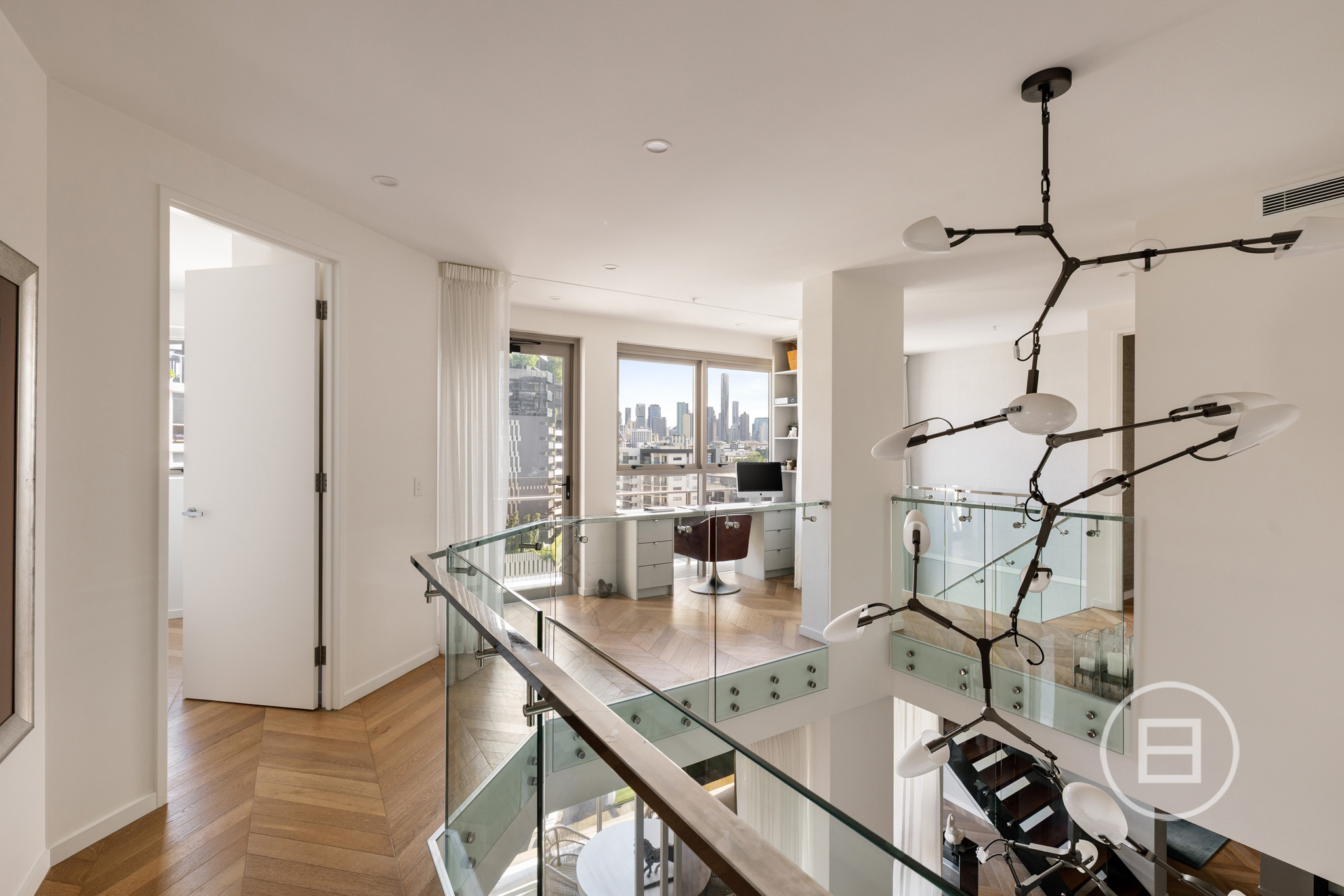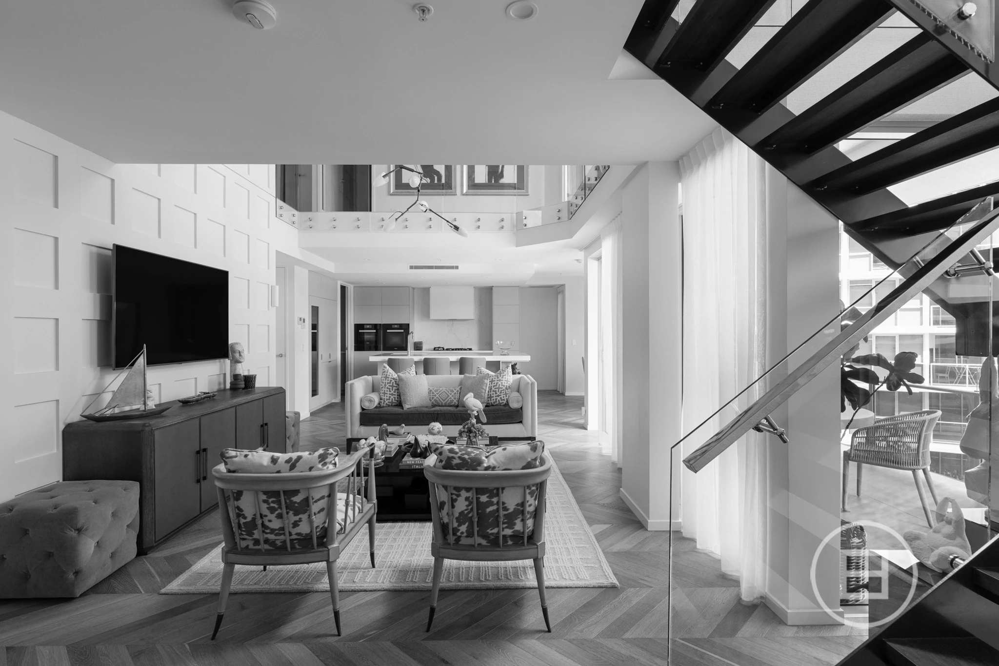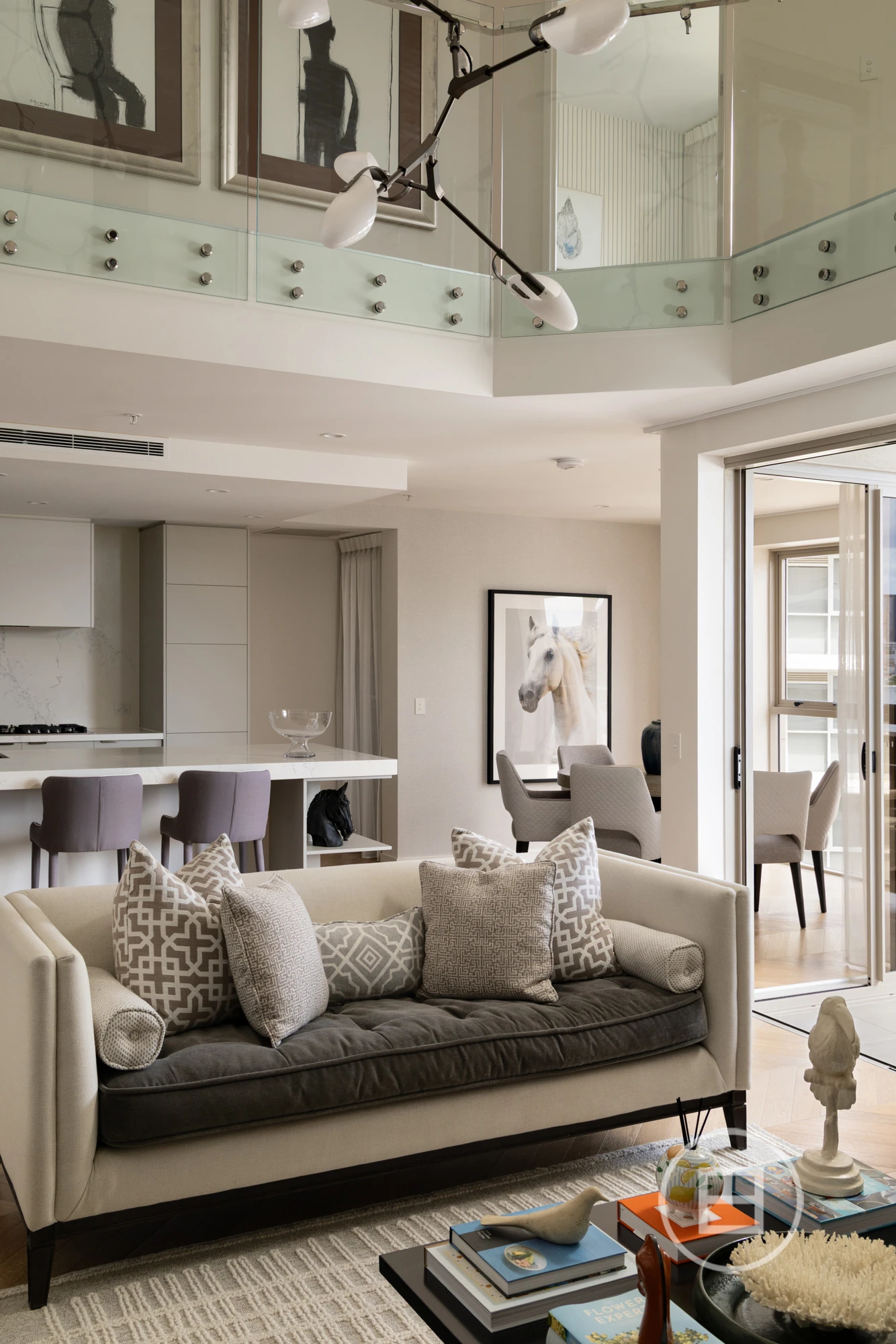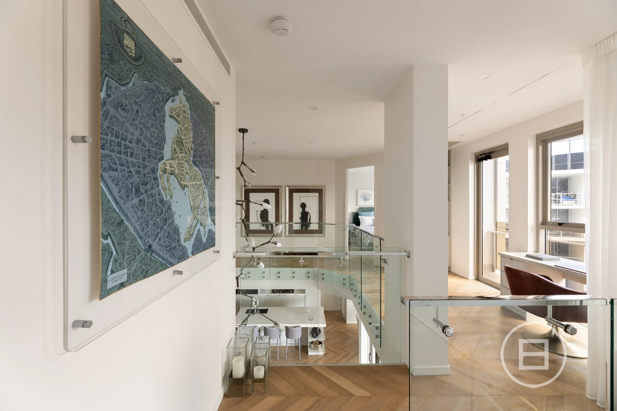 A dramatic six metre internal void forms the centrepiece of the home, linking both levels via a bespoke timber and glass staircase while creating striking volume through double height ceilings. Sweeping city views extend across both levels, amplifying the feeling of elevation and exclusivity.