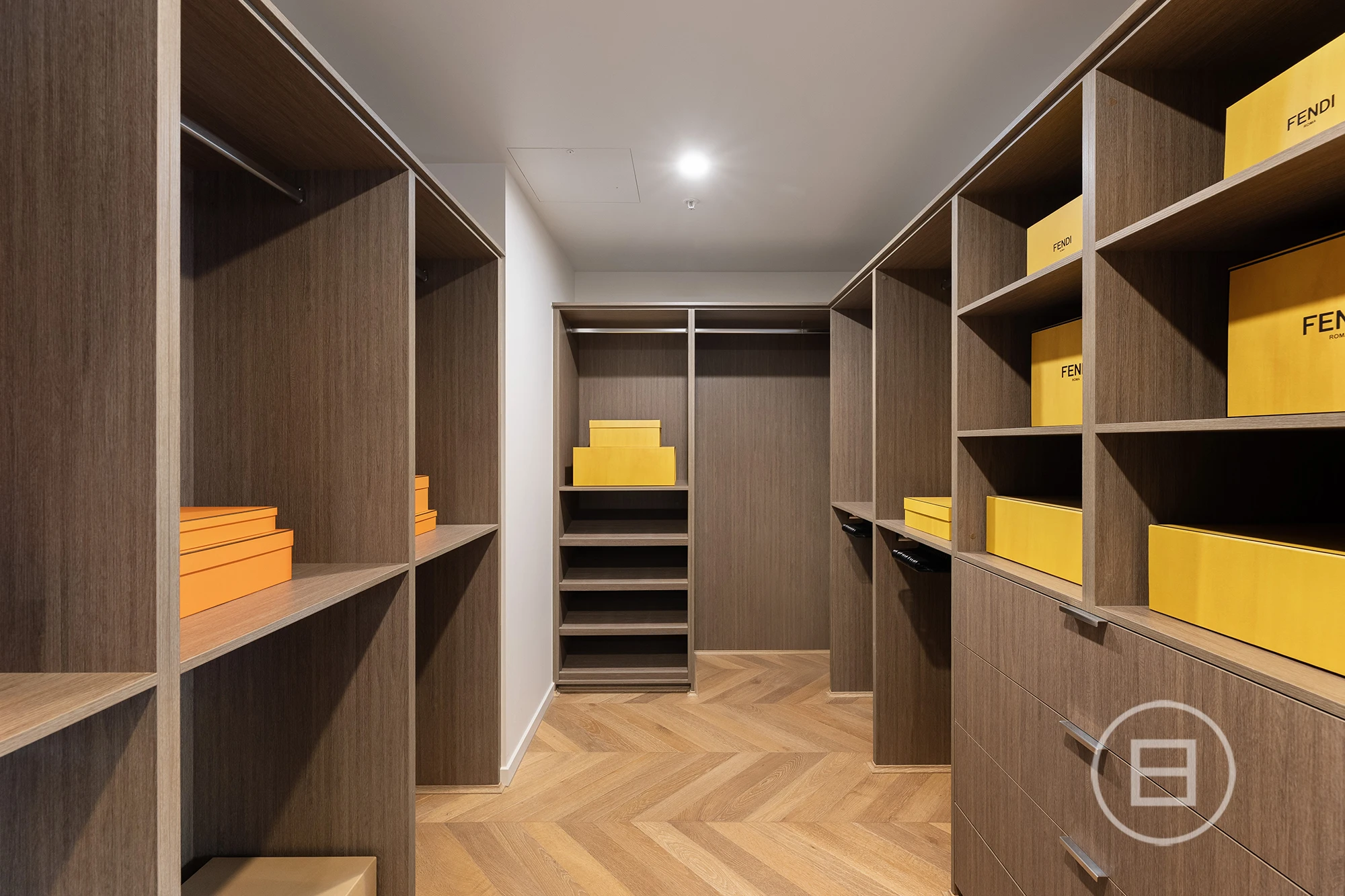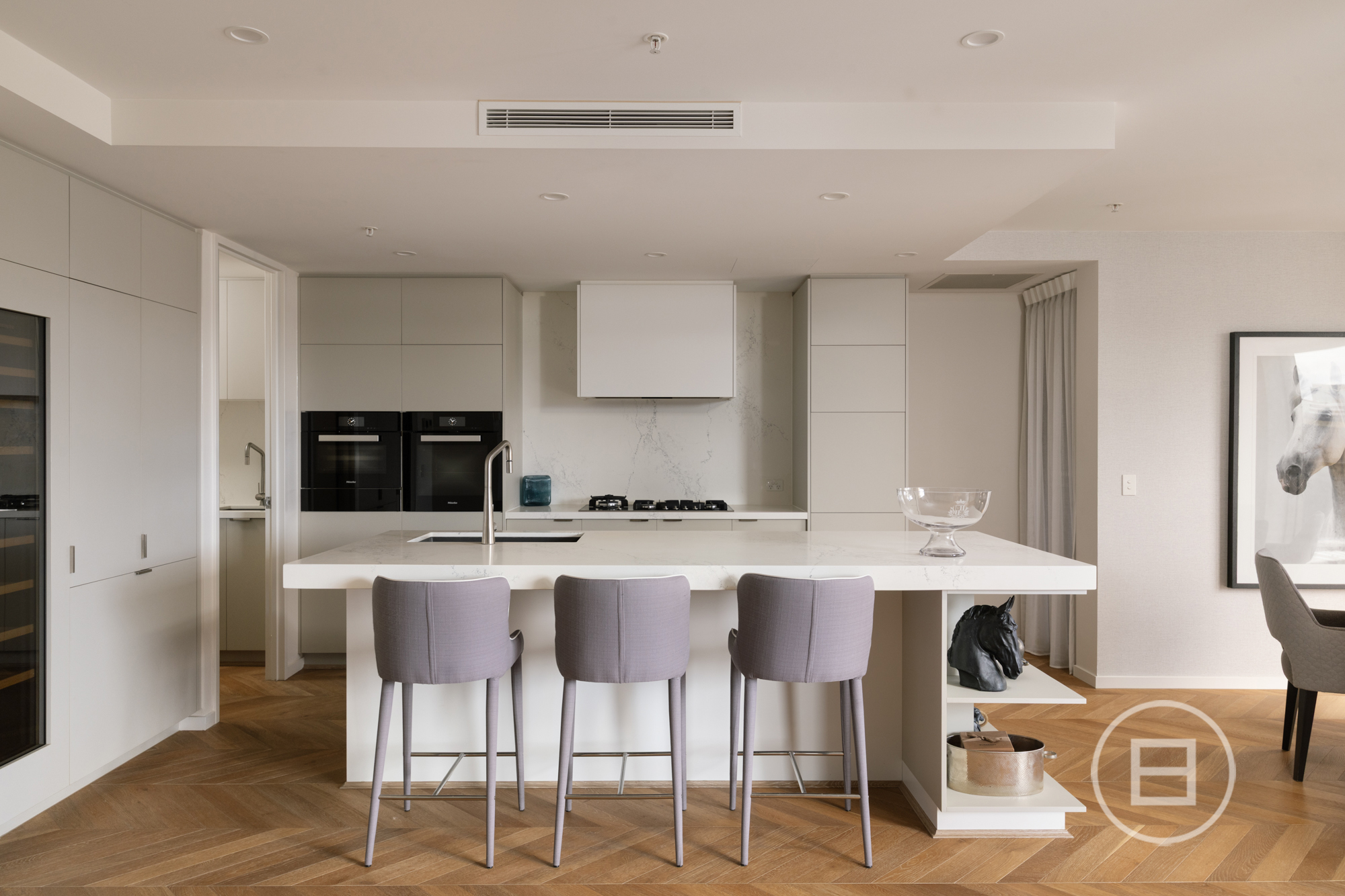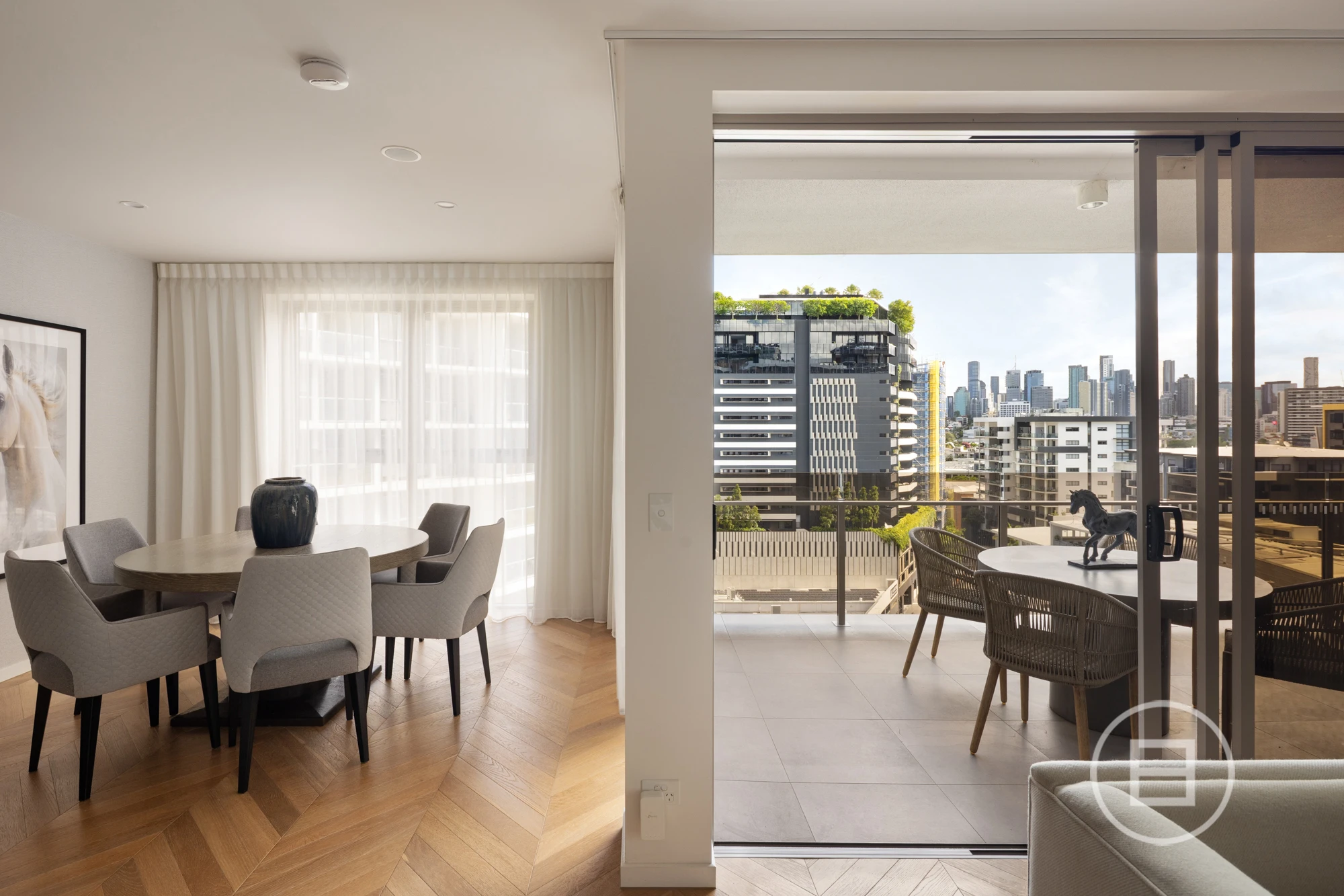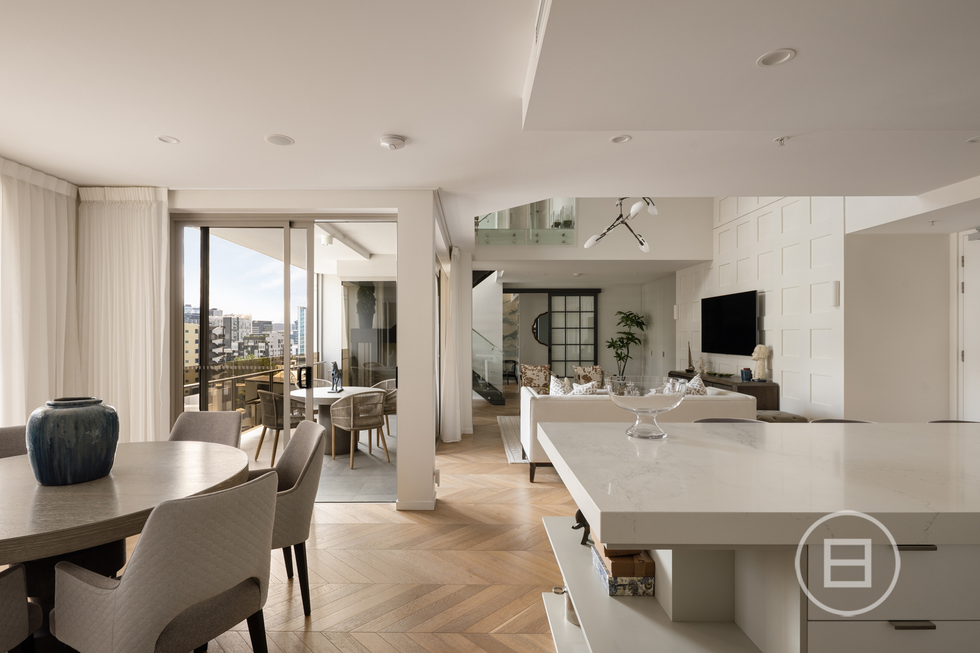 Natural oak chevron flooring flows throughout, pairing warmth and texture with high level finishes and extensive custom joinery. The open plan living and dining domain extends seamlessly to multiple balconies, delivering effortless indoor outdoor living suited to both everyday luxury and entertaining.