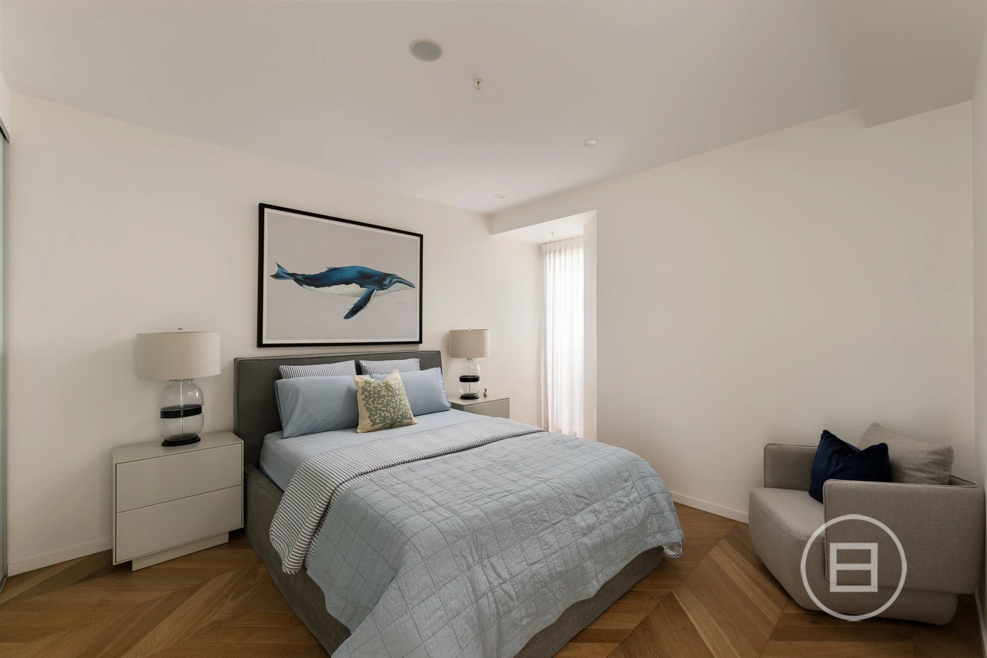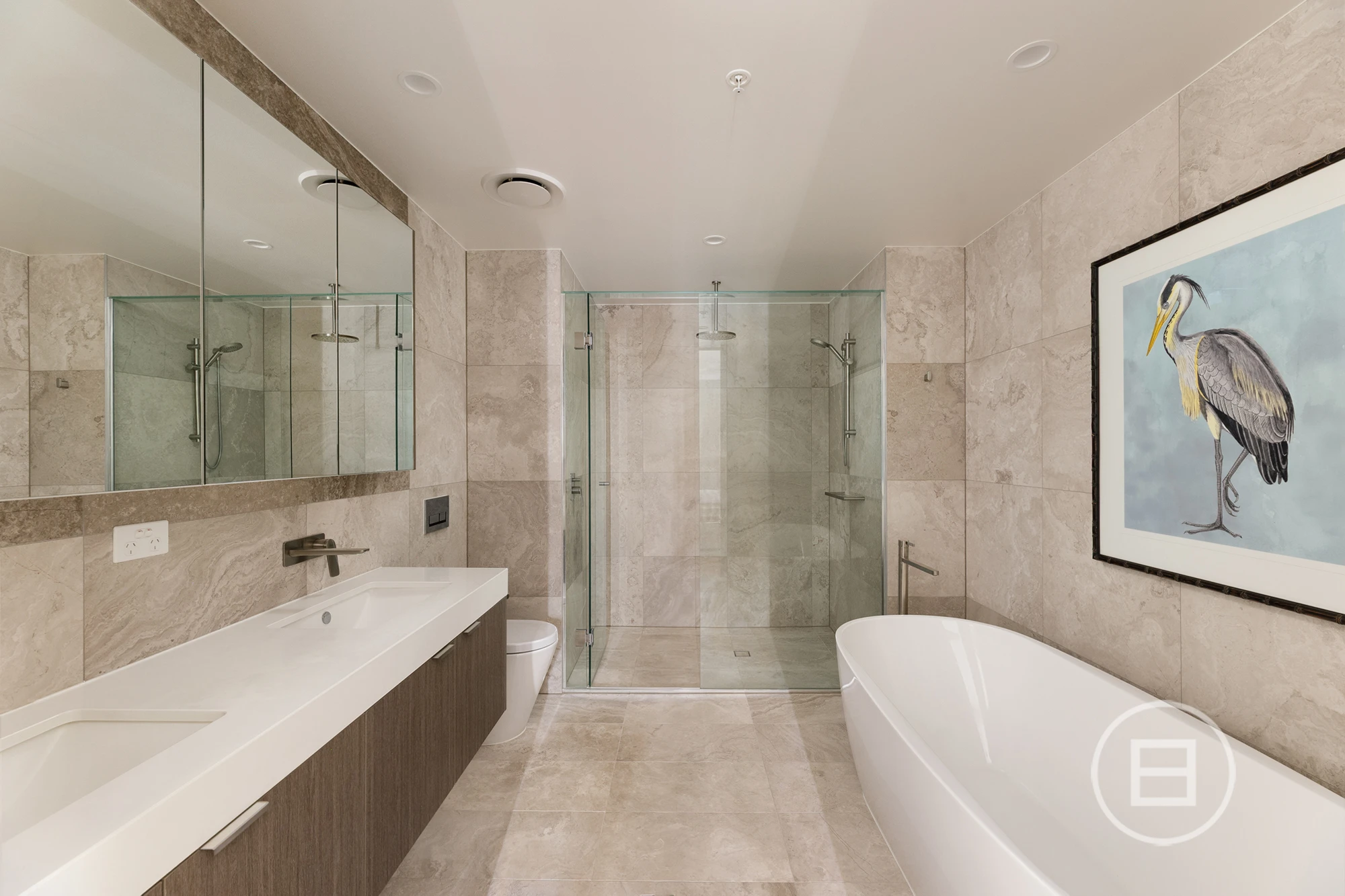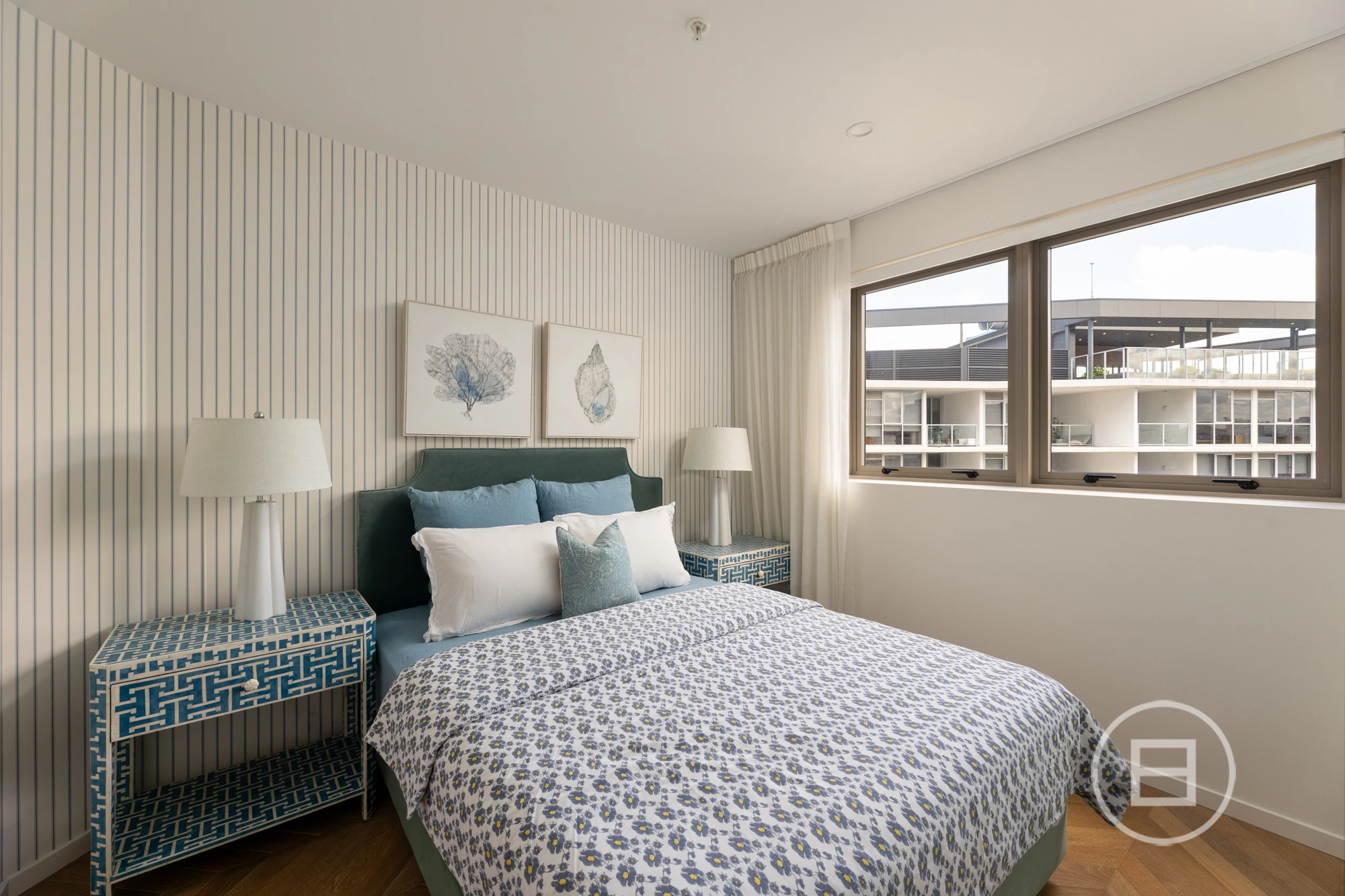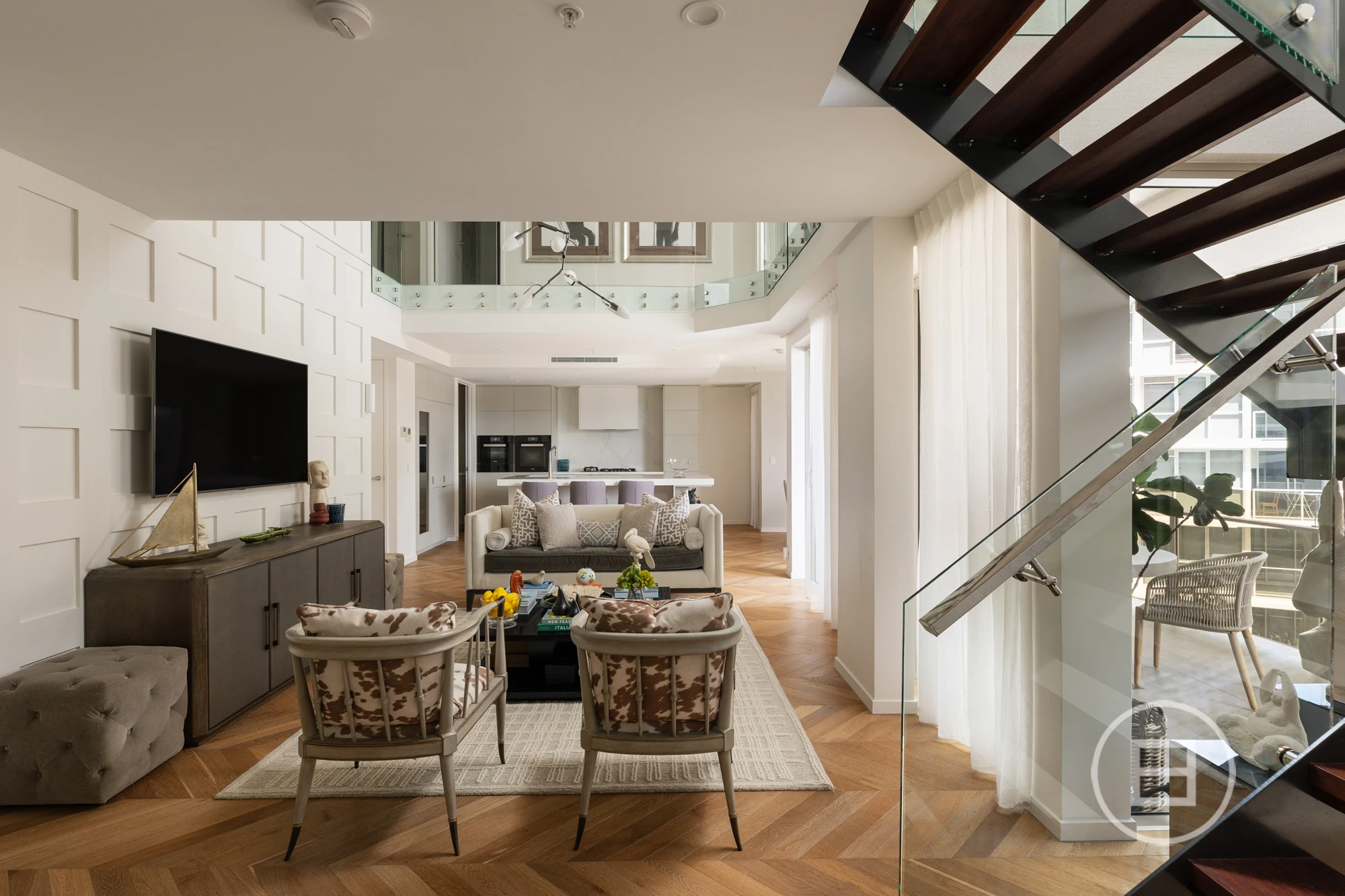 Natural oak chevron flooring flows throughout, pairing warmth and texture with high level finishes and extensive custom joinery. The open plan living and dining domain extends seamlessly to multiple balconies, delivering effortless indoor outdoor living suited to both everyday luxury and entertaining.