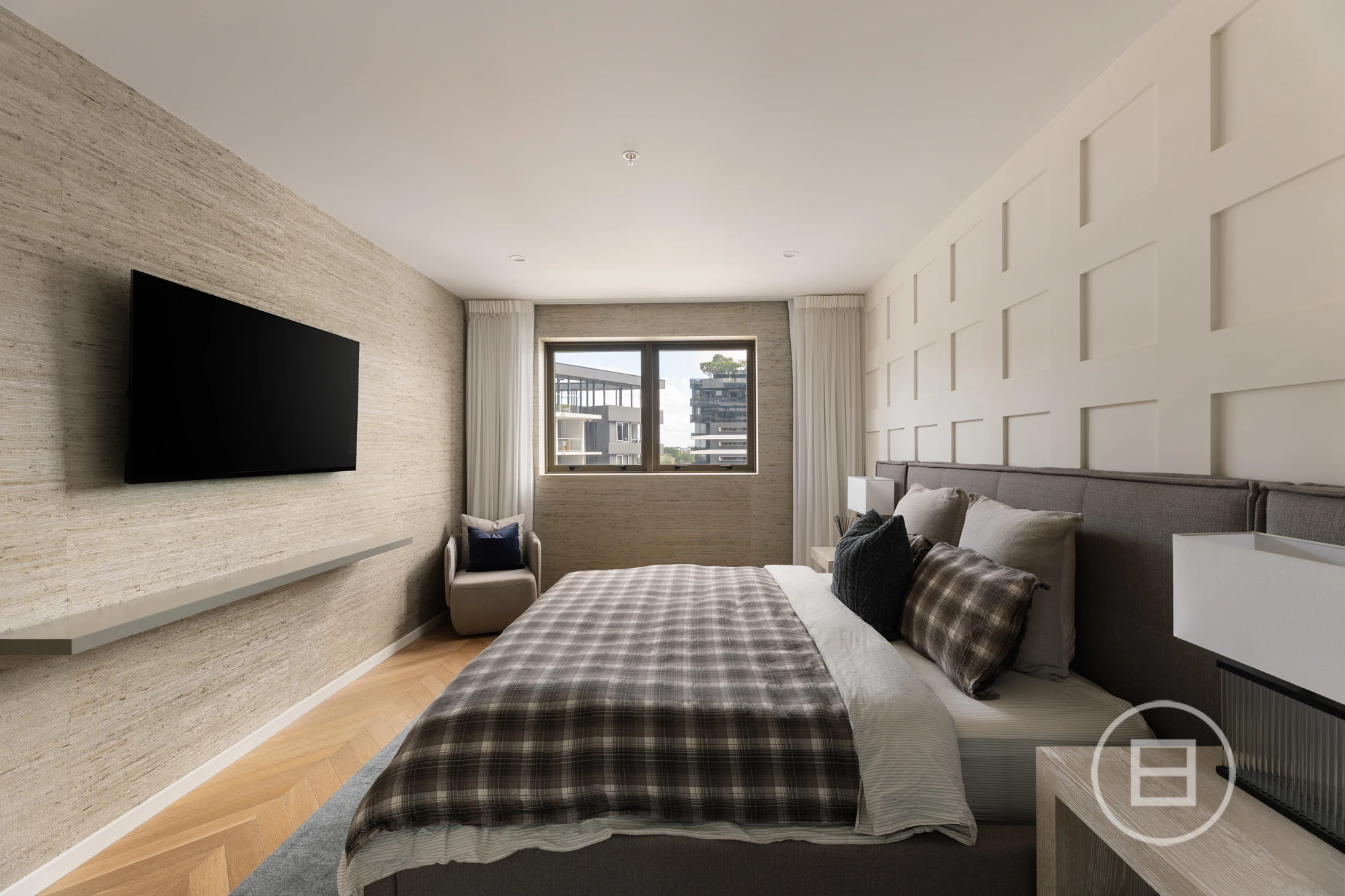 The master retreat has been meticulously crafted as a private sanctuary, featuring bespoke timber detailing and statement finishes, flowing into a custom dressing room and a hotel inspired ensuite wrapped in natural stone, complete with oversized shower and freestanding bath.