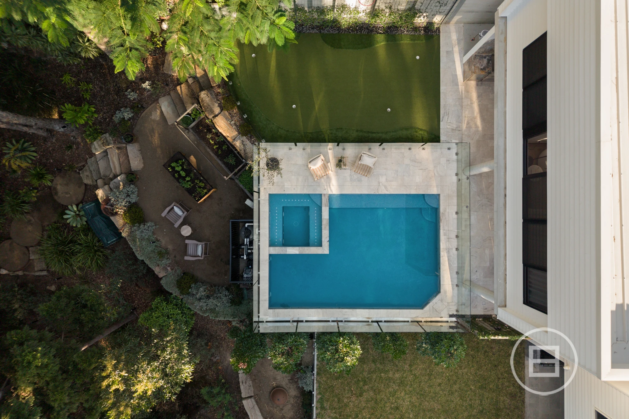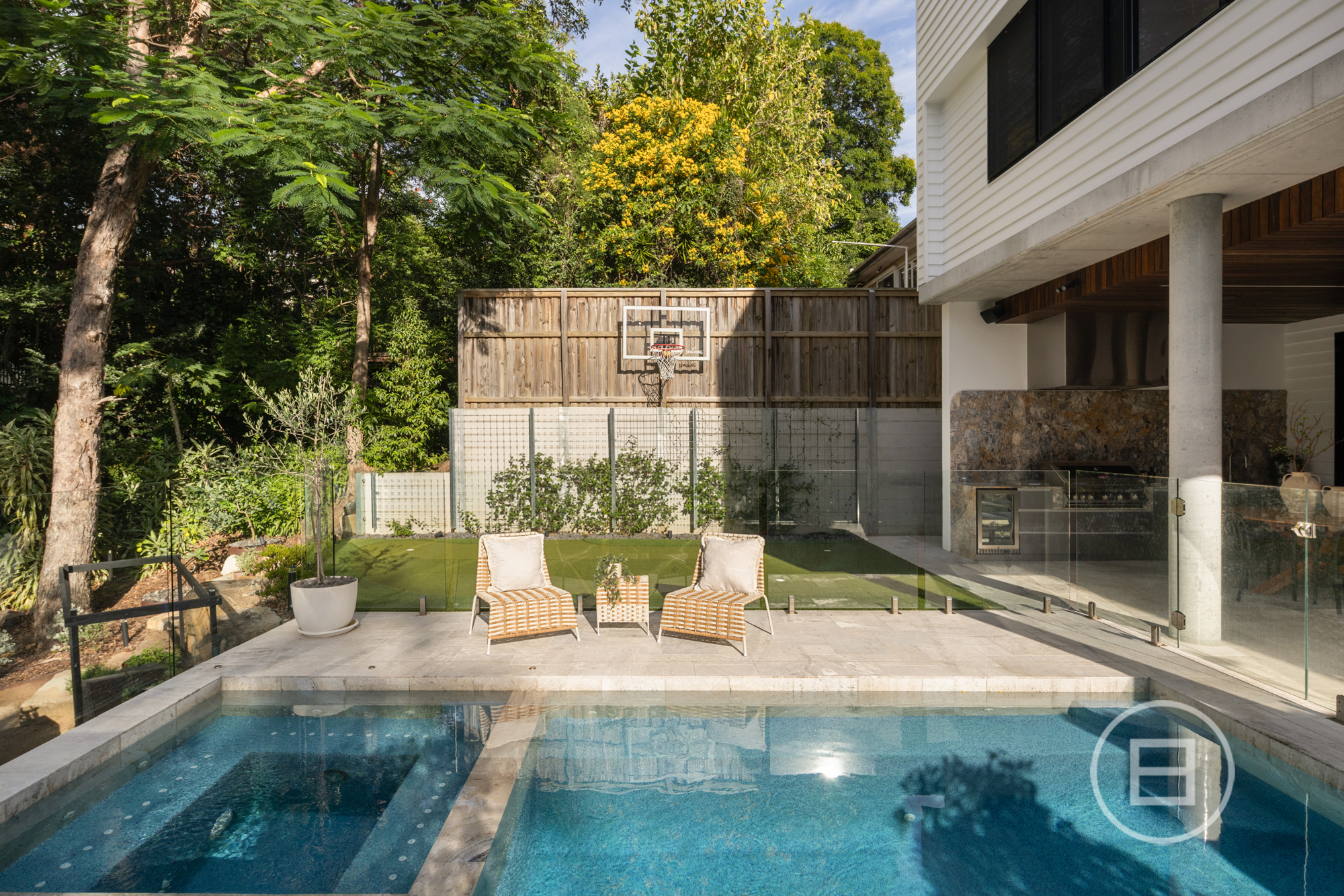 Living and entertaining flow effortlessly. Main living zones connect to a resort-style outdoor setting, comprising a freshwater pool with integrated spa, custom stainless outdoor kitchen with plumbed Beefeater BBQ, and fully landscaped surrounds. The rear of the home offers an incredibly private, tranquil outlook, framed by established greenery. A rare sense of retreat within this exclusive pocket.