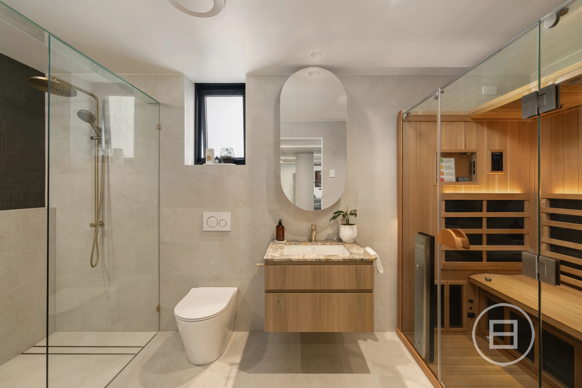 Lifestyle amenities include a dedicated gym, clearlight sauna, media room with 7.1 surround sound, and a dry bar with 280-bottle Vintec wine storage.